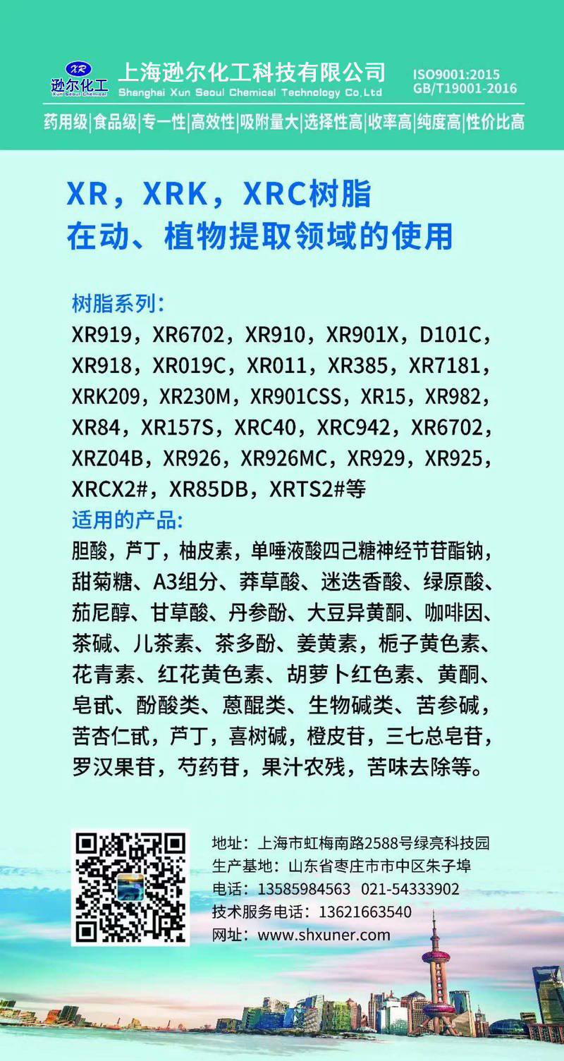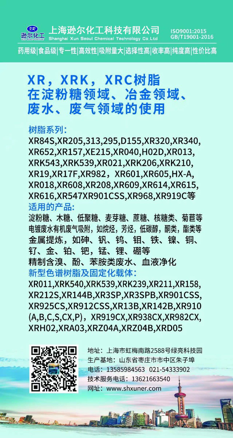 上海遜爾化工科技有限公司是上海市新型的高分子材料研發、生產、應用相結合的高科技公司。公司具有完善的自主知識產權創新體系,與華東理工大學,江南大學,浙江工業大學等科研應用平臺合作從事離子交換與吸附樹脂研制、生產和生物醫藥合成與分離工藝,三廢處理工藝開發設計工作。